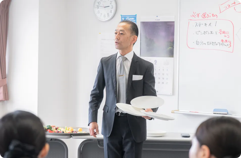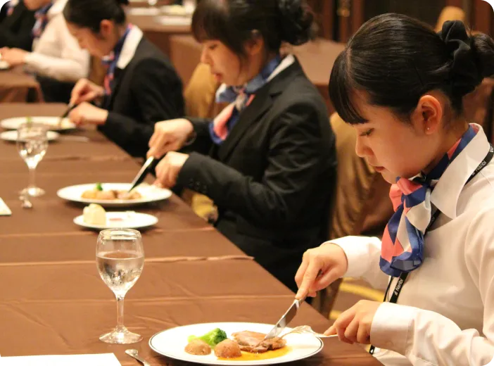 業務内容やテーブルマナーを体系的に学びます。プロによる授業を通して、現場で求められる接客マナーやサービススキルを基礎から着実に身につけます。