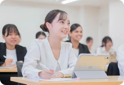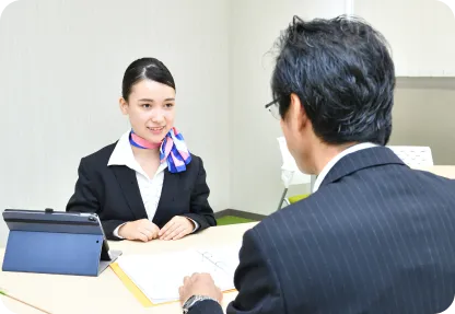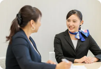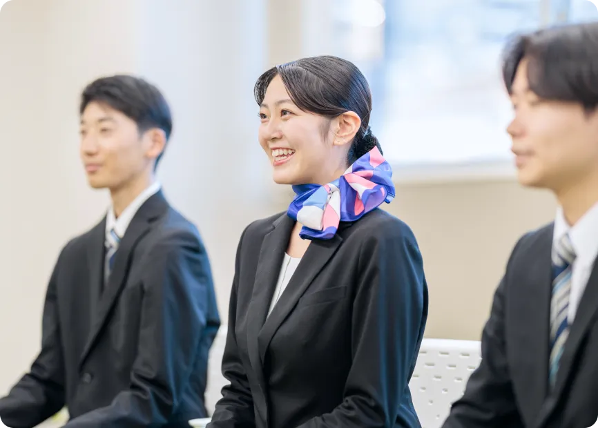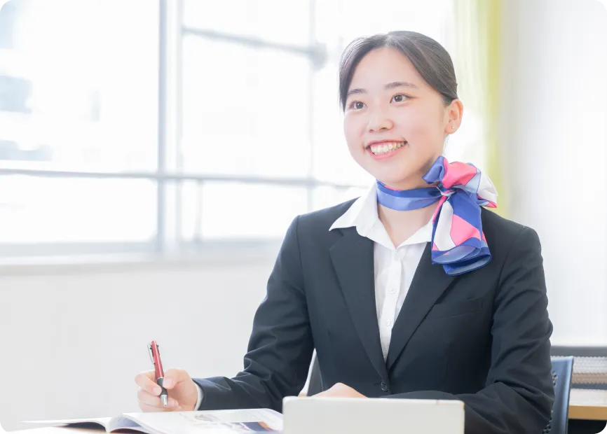 1年次から「就活研究セミナー」、「就活マナー」の授業を通して、就職活動に向けた準備を一つひとつ進めていきます。採用選考で求められる基礎学力にも対応できるよう、国語、数学、社会を含む基礎教養科目をカリキュラムに取り入れている点も特長です。さらに、企業見学会や説明会、OB・OGによるキャリア講座、就活メイクやスーツの着こなし講座など、多彩なプログラムを実施。就職活動を“ゴール”とせず、航空・ホテル業界で活躍し続けるための土台となる力を育みます。