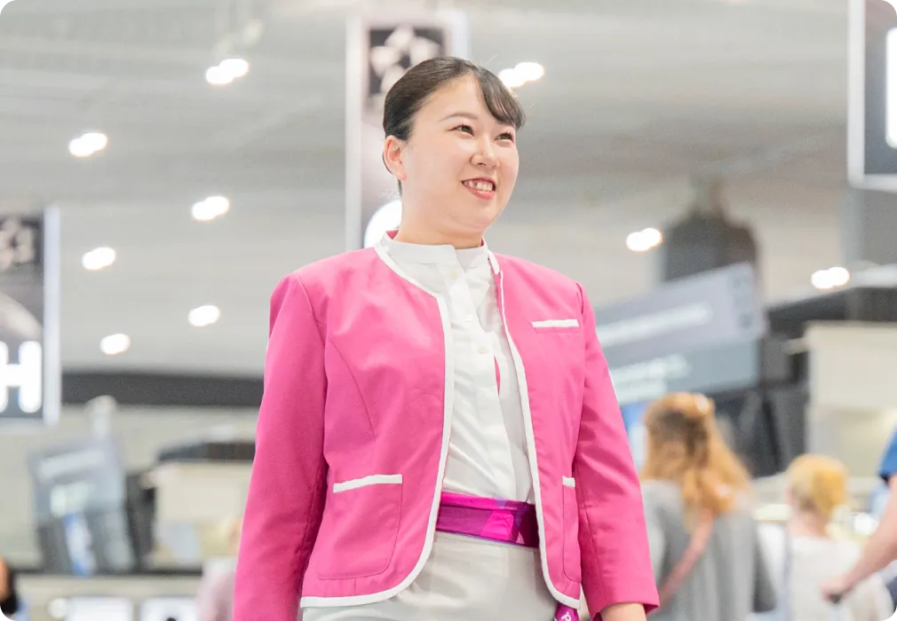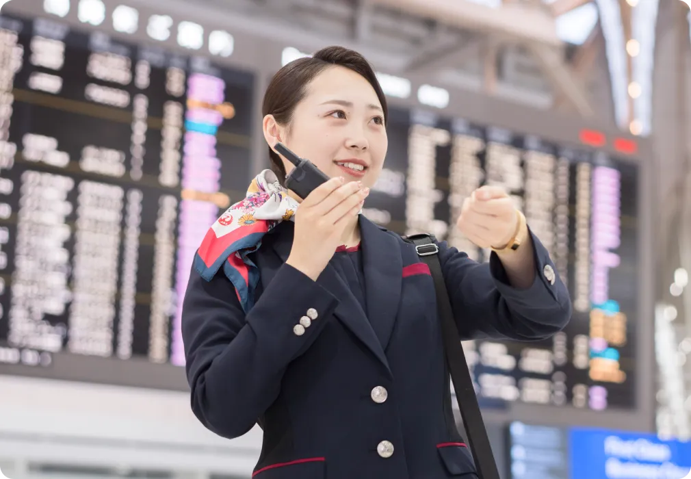 高校時代に空港を利用した際、グランドスタッフの方が笑顔で対応してくれたことに感銘を受けてその道を目指すことにしました。様々な国籍の方が行き交う「空港」という場所も魅力に感じていました。現在は、便の責任者業務やエアポートサポートデスク、新入社員のインストラクター業務を担当しています。限られた時間の中で便を定時に出発させることができたときや、お客様のご要望にお応えして‟ありがとう“とお伝えいただいた時には、とてもやりがいを感じます。